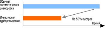 Технология инверторной турборазморозки  Еще одна инновационная разработка – инверторная турборазморозка, усовершенствованная микроволновая система размораживания продуктов. В основу этой технологии положен принцип, который ученые называют «теорией хаоса». Здесь распределение микроволновой энергии происходит с оптимальным чередованием регулярности и нерегулярности. Благодаря этому эффекту любые продукты размораживаются в два раза быстрее. Автоматическая турборазморозка позволяет размораживать продукты одним нажатием кнопки, без указания веса продукта и времени процесса. Эти параметры устанавливаются сенсорами печи автоматически.