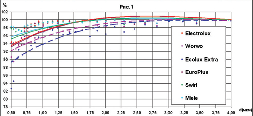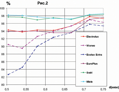 Проведение тестирования Пыль имитировалась частицами молотого кварца со средним медианным размером 3 m (50% частиц размером менее 3 микрон и 50% частиц размером более 3 микрон). Облако такой пыли, создаваемое генератором пыли «Fluidized Bed Aerosol», направлялось вентилятором в воздуховод, в котором находился тестируемый пылесборник. Поток имел характерное для пылесосов значение F=35 л/с (126 м3/час). С помощью аэродинамического счетчика частиц («Aerodynamic Particle Sizer»), принцип действия которого основан на лазерном методе, проводился дисперсный анализ облака, то есть определялась концентрация частиц различного диаметра в интервале от 0,5 до 30 m (всего более 50 точек). Измерения проводились в обоих потоках — начальном и прошедшем через пылесборник, что позволяло получить как распределение эффективности (степени фильтрации) пылесборника в зависимости от размера частиц, так и ее интегральное значение.