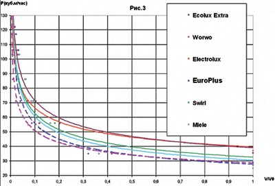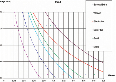 2. ПАДЕНИЕ МОЩНОСТИ  Для выяснения того, как меняется мощность всасывания по мере заполнения пылесборника, строилась кривая зависимости производительности от массы пыли. Поток, состоящий из частиц молотого кварца, поступал в пылесборник до тех пор, пока скорость воздуха за пылесборником не достигала критического значения. Но поскольку тестируемые пылесборники имели разный объем, то для того чтобы полученные значения можно было сравнивать, мы перестроили график, взяв в качестве аргумента относительную массу (отношение массы, соответствующей конкретному значению производительности, к массе при полностью заполненном пылесборнике). Однако из-за большой плотности кварца, во много раз превосходящей плотность пыли, скорость потока за пылесборником достигала критического значения задолго до заполнения всего объема. Зная из повседневного опыта, что заполненный пылью пылесборник объемом 3 литра весит примерно 1 кг (если, конечно, это обычная пыль, а не строительный мусор), мы приняли плотность пыли, чрезвычайно неоднородной по своему составу, равной 0,3 г/см3 (для примера, близкое значение плотности имеют такие вещества, как пробка или древесный уголь). Такое допущение позволило определить максимальную массу пыли для пылесборника данного объема и перейти к относительным массам (или, что то же самое, как следует из известного со школы соотношения между плотностью и массой Р = m/V, к относительным объемам). Результат для всех тестируемых моделей представлен на рис. 3. При этом, хотя значениям V/Vmax вряд ли стоит доверять из-за взятого «с потолка» значения плотности, возможность сопоставления хода кривых для разных пылесборников сомнения не вызывает. 1. Как можно видеть, быстрое падение мощности (по степенному закону с дробным отрицательным показателем) происходит до того момента, пока она не достигнет значения, равного примерно половине первоначального.  2. Обозначенные пунктирными линиями кривые для двухслойных пылесборников лежат ниже, чем для многослойных, что подтверждает факт уменьшения падения мощности в многослойных пылесборниках. Ощутимее продемонстрировать различия позволяет увеличенный масштаб рис. 4, где зависимость производительности от относительного объема построена на участке 55Ј0,5 Pmax ЈP 75. А также таблица 3, где приведены значения относительного объема для каждой модели, соответствующие P=0,5Pmax. Таким образом, максимальное различие, наблюдаемое между двухслойным пылесборником «Worwo» и многослойным «Euro Plus», показывает, что пылесос будет работать в 3,8 раза дольше, прежде чем производительность уменьшится вдвое. При дальнейшем заполнении пылесборников, как следует из рис. 3, различие между многослойными «Electrolux» и «Europlus», как и между двухслойными «Worwo» и «Ecolux Extra», перестает существовать. Но общая тенденция сохраняется, и если при падении производительности до значения, равного трети от максимального, пара многослойных пылесборников заполняется полностью, то двухслойных — только на треть. Итоги В этой статье нам хотелось, рассказав о важной роли пылесборников и сравнив разные их типы, помочь потребителю сориентироваться в том, что предлагает рынок. Правда, о полной «свободе выбора» говорить не приходится, поскольку пылесборники делаются под конкретные модели пылесосов. Но, во-первых, один тип пылесборника подходит, как п
